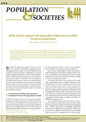 If health conditions remain the same as today's, the population of dependent persons aged 75 and over should increase by 70% in Europe between now and 2030. Over the same period, the proportion of that population having neither partner nor surviving children should decline in favour those with at least one potential family carer (partner or child). The situations of disabled elders will continue to differ according to sex, with men having a considerably greater chance than women of having a partner with them. The population needing formal care will increase as a result of the increasing numbers of very elderly, a higher proportion of male family carers and the more frequent survival of couples in which both partners are dependent